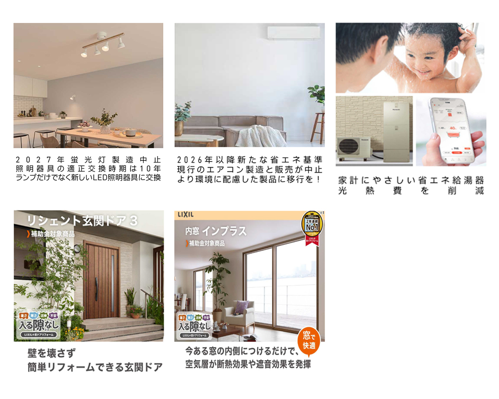 照明・エアコン・給湯器・玄関ドアの取り替えや内窓の設置によるエネルギー効率の改善や光熱費削減など、住まいの見直しポイントをご紹介します。